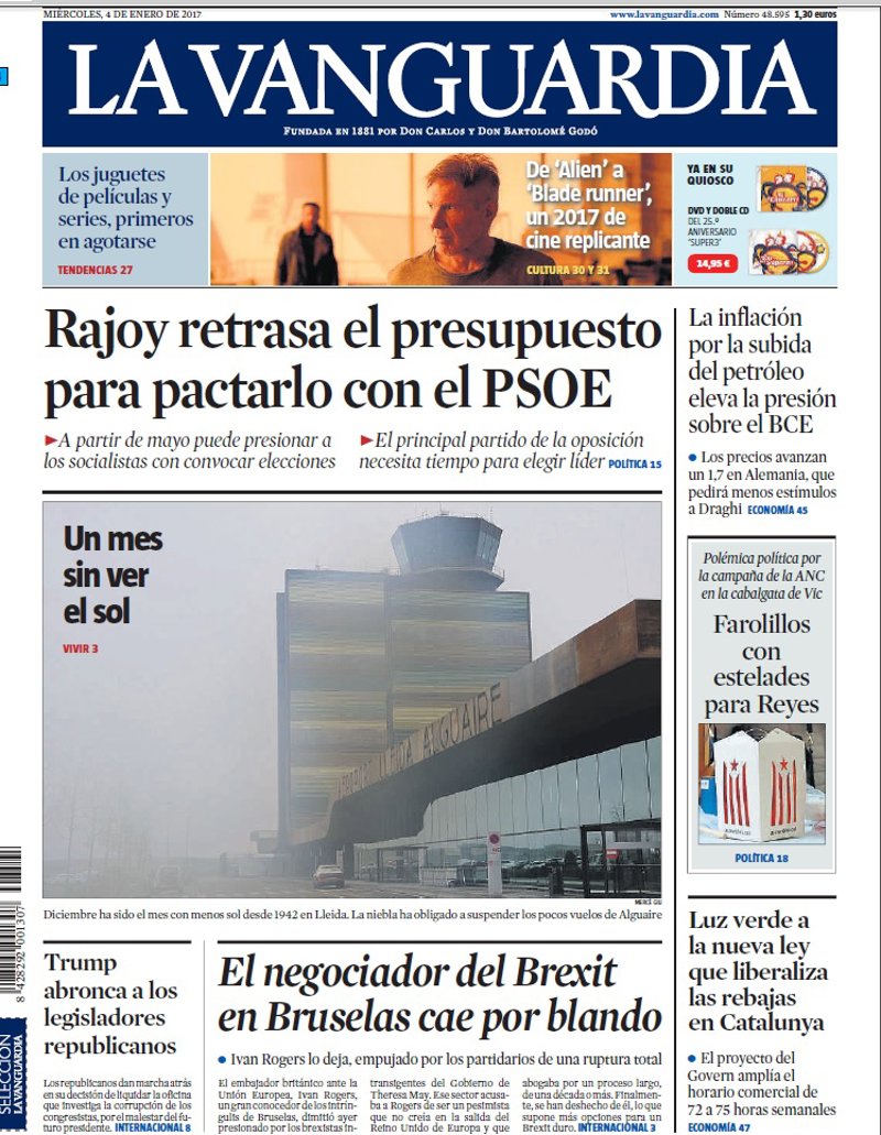 LA VANGUARDIA: "Rajoy retrasa el presupuesto para pactarlo con el PSOE"; "Un mes sin ver el sol. Diciembre ha sido el mes con menos sol desde 1942 en Lleida"; "El negociador del Brexit en Bruselas cae por blando"; "Trump abronca a los legisladores republicanos"; "La inflación por la subida del petróleo eleva la presión sobre el BCE"; "Farolillos con estelades para Reyes"; "Luz verde a la nueva ley que liberaliza las rebajas en Catalunya".