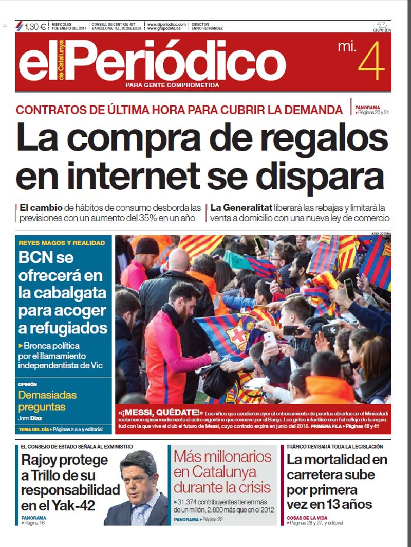 EL PERIÓDICO: "La compra de regalos en internet se dispara"; ""¡Messi, quédate!". Los niños que acudieron ayer al entrenamiento de puertas abiertas en el Miniestadi reclamaron apasionadamente al astro argentino que renueve por el Barça"; "BCN se ofrecerá en la cabalgata para acoger a refugiados"; "Rajoy protege a Trillo de su responsabilidad en el Yak-42"; "Más millonarios en Catalunya durante la crisis"; "La mortalidad en carretera sube por primera vez en 13 años".