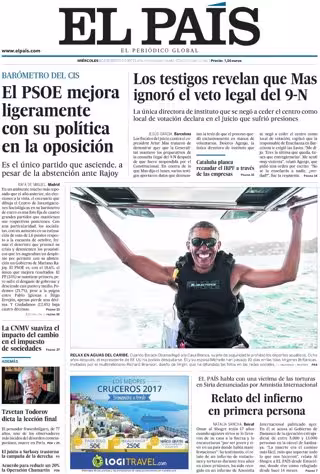 EL PAÍS: "El PSOE mejora ligeramente con su política en la oposición"; "Los testigos revelan que Mas ignoró el veto legal del 9-N"; "Cataluña planea recaudar el IRPF a través de las empresas"; "La CNMV suaviza el impacto del cambio en el impuesto de sociedades"; "Relato del infierno en primera persona. EL PAÍS habla con una víctima de las torturas en Siria denunciadas por Amnistía Internacional".