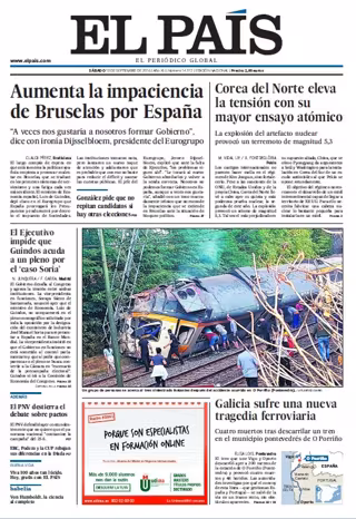 EL MUNDO: "Triple reprimenda de Europa al Gobierno por su parálisis"; "El tren accidentado en O Porriño iba por una vía secundaria por obras. Cuatro personas mueren y 48 resultan heridas al descarrilar el convoy que cubre la línea Vigo-Oporto"; "Podemos, la CUP y ERC celebran su Diada para competir con Convergència"; "Pucherazo en València en Comù con móviles del mercado negro"; "Corea del Norte realiza su quinto ensayo nuclear"; "La Guardia Civil rastrea la ría de Arousa en busca de Diana Quer".