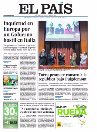 EL PAÍS: "Inquietud en Europa por un Gobierno hostil en Italia": "Torra promete construir la república bajo Puigdemont"; "Su compañía telefónica es ahora también su banco. Los operadoras incluyen pagos de productos que se abonan junto con la factura mensual"; "Cifuentes, imputada por falsear el máster".