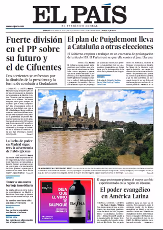 EL PAÍS: "Fuerte división en el PP sobre su futuro y el de Cifuentes"; "El plan de Puigdemont lleva a Cataluña a otras elecciones"; "La monumental crecida del Ebro"; "El poder evangélico en América Latina. El auge protestante plasma el mayor cambio experimentado en la región en décadas"; "La lucha de poder en Madrid sigue tras la advertencia de Pablo Iglesias".