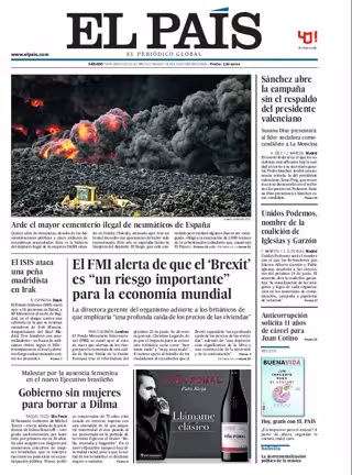 EL PAÍS: "Arde el mayor cementerio ilegal de neumáticos de España"; "El FMI alerta de que el 'Brexit' es "un riesgo importante" para la economía mundial"; "El ISIS ataca una peña madridista en Irak"; "Gobierno sin mujeres para borrar a Dilma. Malestar por la ausencia femenina en el nuevo Ejecutivo brasileño"; "Sánchez abre la campaña sin el respaldo del presidente valenciano"; "Unidos Podemos, nombre de la coalición de Iglesias y Garzón"; "Anticorrupción solicita 11 años de cárcel para Juan Cotino".