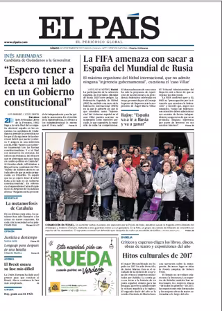 EL PAÍS: "Inés Arrimadas, candidata de Ciudadanos a la Generalitat: "Espero tener a Iceta a mi lado en un Gobierno constitucional""; "La FIFA amenaza con sacar a España del Mundial de Rusia. Rajoy: "España va a ir a Rusia y va a ganar""; "Conmoción en Teruel. Un exmilitar serbio, buscado por asesinato por la Policía de Italia, desató el jueves la tragedia entre Albalate del Arzobispo y Andorra (Teruel), matando a dos guardias civiles y a un ganadero"; "Hitos culturales de 2017. Críticos y expertos eligen los libros, discos, obras de teatro y exposiciones del año".