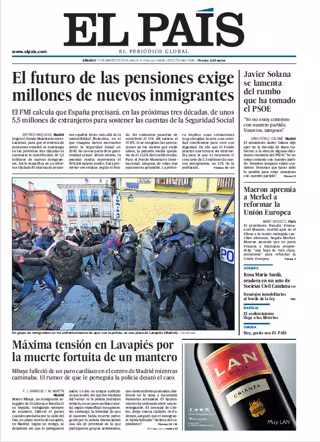 EL PAÍS: "El futuro de las pensiones exige millones de nuevos inmigrantes. El FMI calcula que España precisará, en las próximas tres décadas de unos 5,5 millones de extranjeros para sostener las cuentas de la Seguridad Social"; "Máxima tensión en Lavapiés por la muerte fortuita de un mantero"; "Javier Solana se lamenta del rumbo que ha tomado el PSOE"; "Macron apremia a Merkel a reformar la Unión Europea".