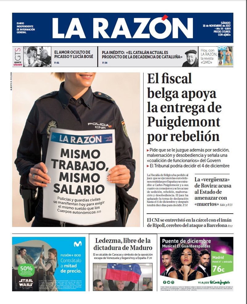 LA RAZÓN: "Mismo trabajo, mismo salario. Policías y guardias civiles se manifiestan hoy para exigir el mismo sueldo que los Cuerpos autonómicos"; "El fiscal belga apoya la entrega de Puigdemont por rebelión. La "vergüenza" de Rovira: acusa al Estado de amenazar con "muertos""; "El CNI se entrevistó en la cárcel con el imán de Ripoll, cerebro del ataque a Barcelona"; "Ledezma, libre de la dictadura de Maduro".