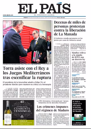 EL PAÍS: "Torra asiste con el Rey a los Juegos Mediterráneos tras escenificar la ruptura"; "Decenas de miles de personas protestan contra la liberación de La Manada"; "Los crímenes impunes del régimen de Maduro. La ONU denuncia a Venzuela por "graves violaciones de los derechos humanos""; "Sánchez releva a la cúpula de RTVE con un decreto ley".