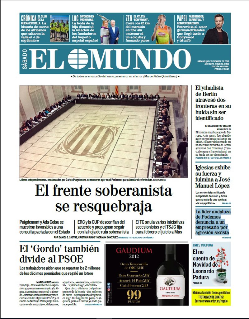 EL MUNDO: "El frente soberanista se resquebraja. Puigdemont y Ada Colau se muestran favorables a una consulta pactada con el Estado"; "El 'Gordo' también divide al PSOE. Los trabajadores piden que se repartan los 2 millones de los décimos premiados que regaló un lotero"; "El yihadista de Berlín atravesó dos fronteras en su huida sin ser identificado"; "Iglesias exhibe su fuerza y fulmina a José Manuel López"; "La líder andaluza de Podemos denuncia a un empresario por agresión sexista".