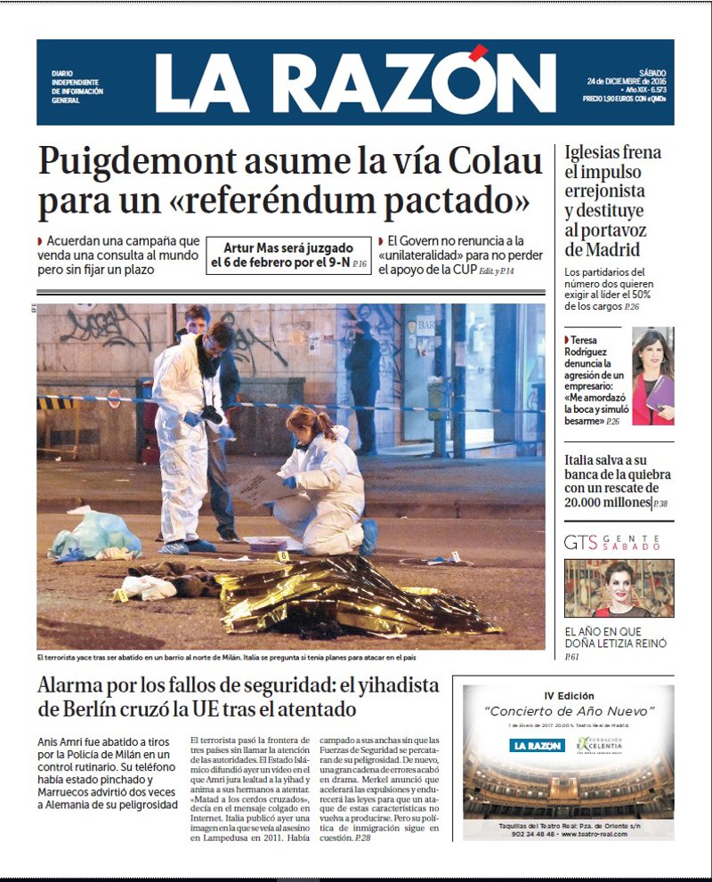 LA RAZÓN: "Puigdemont asume la vía Colau para un "referéndum pactado". Artur Mas será juzgado el 6 de febrero por el 9-N"; "Alarma por los fallos de seguridad: el yihadista de Berlín cruzó la UE tras el atentado"; "Iglesias frena el impulso errejonista y destituye al portavoz de Madrid"; "Teresa Rodríguez denuncia la agresión de un empresario: "Me amordazó la boca y simuló besarme""; "Italia salva a su banca de la quiebra con un rescate de 20.000 millones".