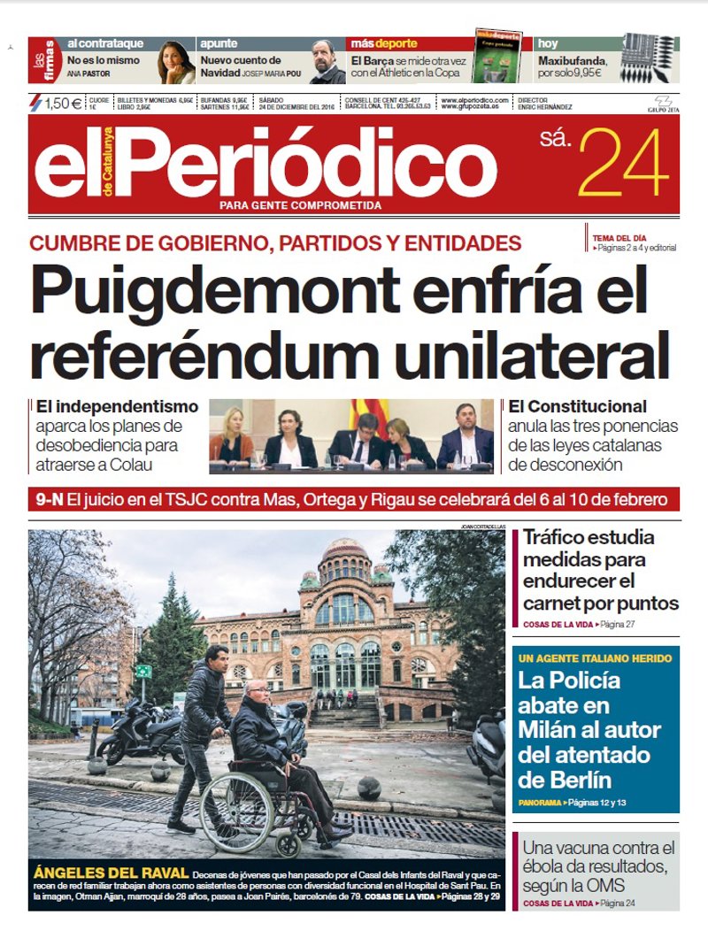 EL PERIÓDICO: "Puigdemont enfría el referéndum unilateral. El independentismo aparca los planes de desobediencia para atraerse a Colau"; "9-N. El juicio en el TSJC contra Mas, Ortega y Rigau se celebrará del 6 al 10 de febrero"; "Ángeles del Raval. Decenas de jóvenes que han pasado por el Casal dels Infants del Raval y que carecen de red familiar trabajan ahora como asistentes de personas con diversidad funcional en el Hospital de Sant Pau"; "Tráfico estudia medidas para endurecer el carnet por puntos"; "La Policía abate en Milán al autor del atentado de Berlín"; "Una vacuna contra el ébola da resultados, según la OMS".