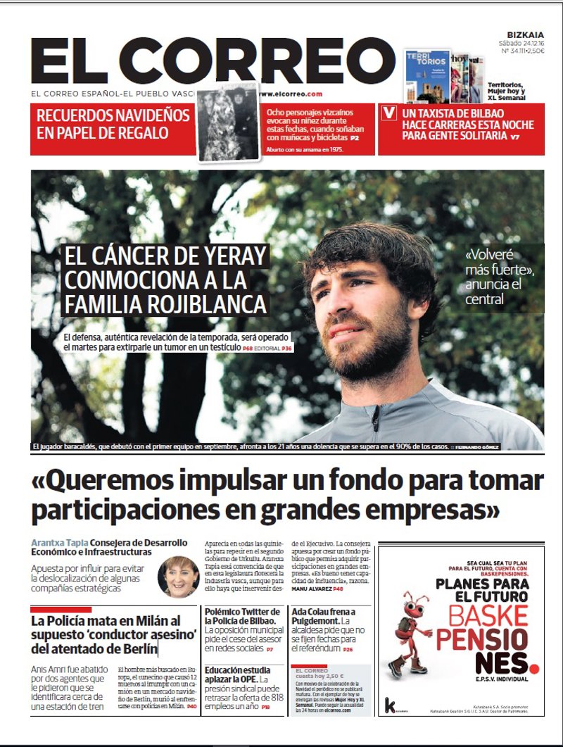 EL CORREO: "El cáncer de Yeray conmociona a la familia rojiblanca. El defensa, auténtica revelación de la temporada, será operado el martes para extirparle un tumor en un testículo"; "Arantxa Tapia, Consejera de Desarrollo Económico e Infraestructuras: "Queremos impulsar un fondo para tomar participaciones en grandes empresas""; "La Policía mata en Milán al supuesto 'conductor asesino' del atentado de Berlín".