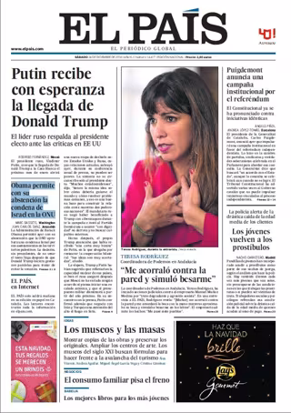 EL PAÍS: "Putin recibe con esperanza la llegada de Donald Trump"; "Teresa Rodríguez, Coordinadora de Podemos en Andalucía: "Me acorraló contra la pared y simuló besarme""; "Puigdemont anuncia una campaña institucional por el referéndum"; "Los jóvenes vuelven a los prostíbulos"; "Obama permite con su abstención la condena de Israel en la ONU".