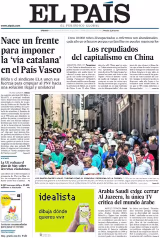 EL PAÍS: "Nace un frente para imponer la 'vía catalana' en el País Vasco"; "Arabia Saudí exige cerrar Al Jazeera, la única TV crítica del mundo árabe"; "La UE rechaza el plan de May sobre derechos ciudadanos"; "Los repudiados del capitalismo en China. Unos 10.000 niños discapacitados o enfermos son abandonados cada año en orfanatos porque sus familias no pueden mantenerlos".