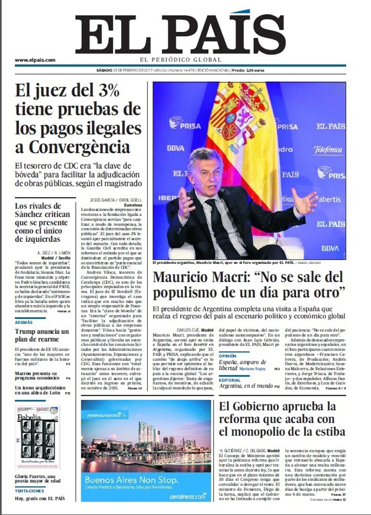 EL PAÍS: "El juez del 3% tiene pruebas de los pagos ilegales a Convergència"; "Mauricio Macri: "No se sale del populismo de un día para otro""; "El Gobierno aprueba la reforma que acaba con el monopolio de la estiba"; "Los rivales de Sánchez critican que se presente como el único de izquierdas"; "Trump anuncia un plan de rearme".