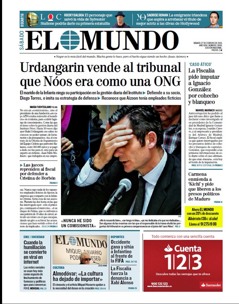 EL MUNDO: "Urdangarin vende al tribunal que Nóos era como una ONG. Las jueces reprenden al fiscal por defender a Cristina de Borbón. "Nunca he sido un comisionista""; "'Caso ático'. La Fiscalía pide imputar a Ignacio González por cohecho y blanqueo"; "Carmena enmienda a 'Kichi' y pide que liberen a los presos políticos de Maduro"; "Cuando la humillación se convierte en viral en internet"; "Almodóvar: "La cultura