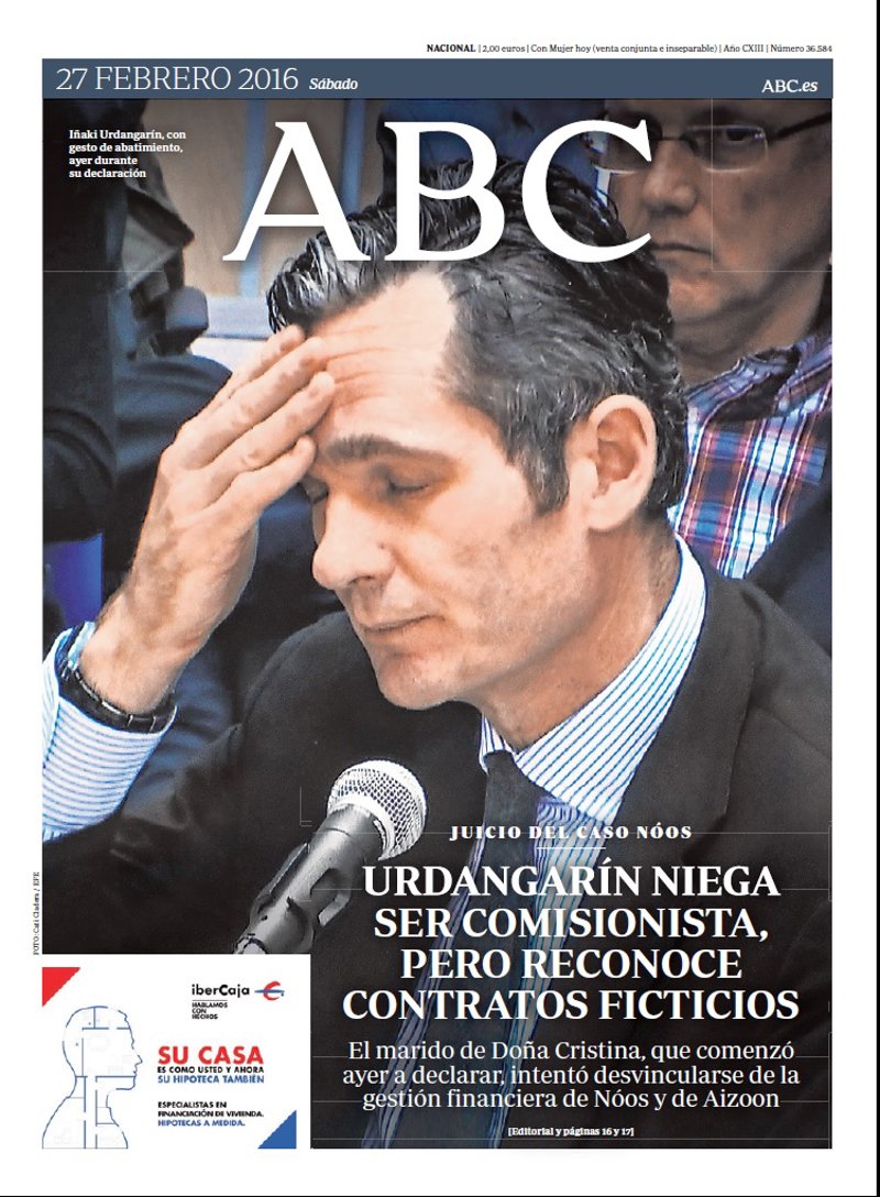 ABC: "Urdangarín niega ser comisionista, pero reconoce contratos ficticios. El marido de Doña Cristina, que comenzó ayer a declarar, intentó desvincularse de la gestión financiera de Nóos y de Aizoon".