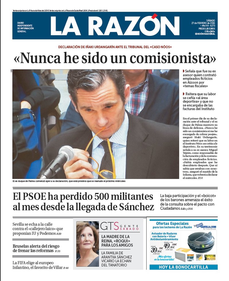 LA RAZÓN: "Declaración de Iñaki Urdangarín ante el tribunal del 'caso Nóos': "Nunca he sido un comisionista""; "El PSOE ha perdido 500 militantes al mes desde la llegada de Sánchez"; "Sevilla se echa a la calle contra el "callejero laico" que proponían IU y Podemos"; "Bruselas alerta del riesgo de frenar las reformas"; "La FIFA elige al europeo Infantino, el favorito de Villar".