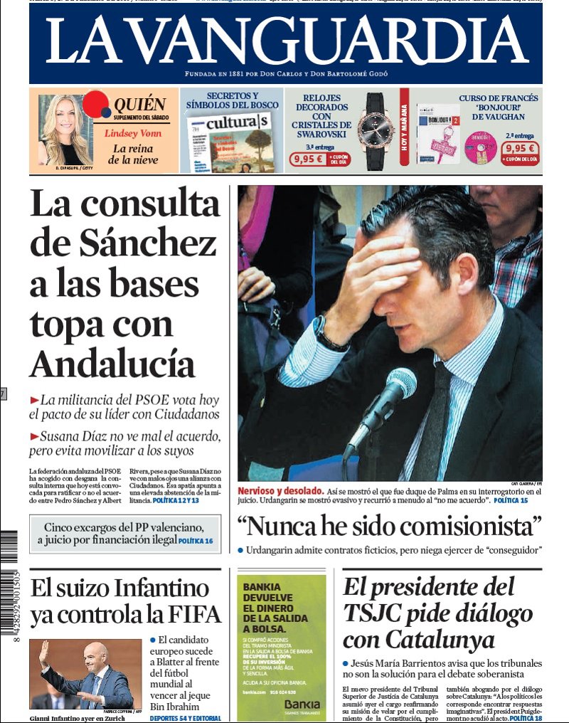 LA VANGUARDIA: "La consulta de Sánchez a las bases topa con Andalucía"; ""Nunca he sido comisionista". Urdangarin admite contratos ficticios, pero niega ejercer de "conseguidor""; "Cinco excargos del PP valenciano, a juicio por financiación ilegal"; "El suizo Infantino ya controla la FIFA"; "El presidente del TSJC pide diálogo con Catalunya".