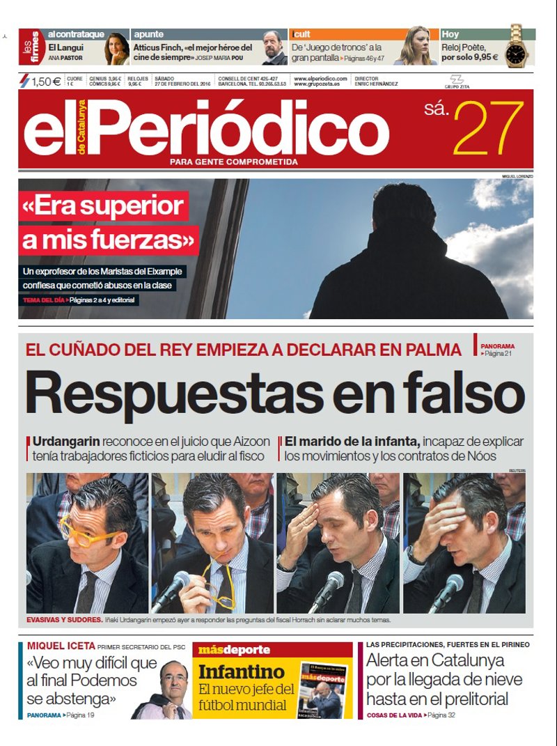 EL PERIÓDICO: ""Era superior a mis fuerzas". Un exprofesor de los Maristas del Eixample confiesa que cometió abusos en la clase"; "El cuñado del Rey empieza a declarar en Palma. Respuestas en falso"; "Miquel Iceta, primer secretario del PSC: "Veo muy difícil que al final Podemos se abstenga""; "Alerta en Catalunya por la llegada de nieve hasta en el prelitorial"; "Infantino. El nuevo jefe del fútbol mundial".