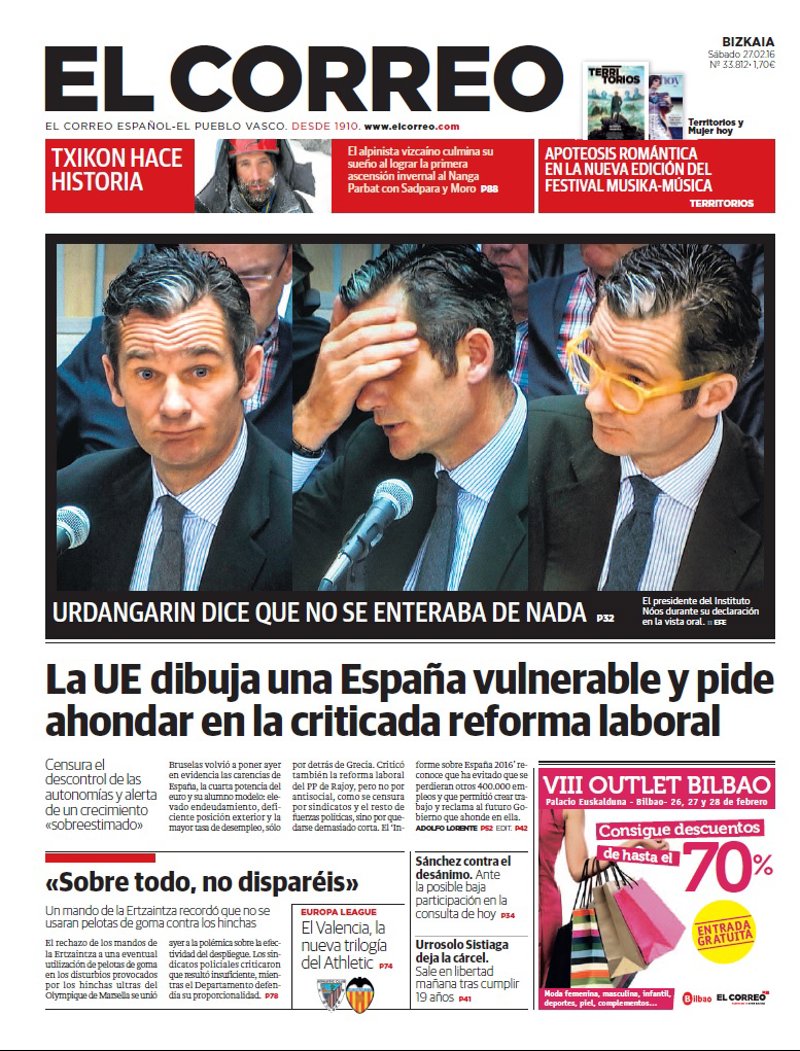 EL CORREO: "Urdangarin dice que no se enteraba de nada"; "La UE dibuja una España vulnerable y pide ahondar en la criticada reforma laboral"; ""Sobre todo, no disparéis". Un mando de la Ertzaintza recordó que no se usaran pelotas de goma contra los hinchas".