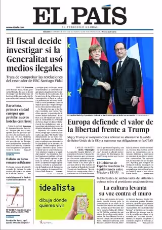 EL PAÍS: "El fiscal decide investigar si la Generalitat usó medios ilegales"; "Europa defiende el valor de la libertad frente a Trump. El Gobierno de España mantiene la equidistancia entre México y EE UU"; "La cultura levanta su voz contra el muro. Intelectuales de ambos lados del Atlántico opinan sobre el presidente estadounidense"; "Barcelona, primera ciudad europea que prohíbe nuevos hoteles céntricos".