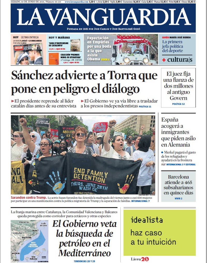 LA VANGUARDIA: "Sánchez advierte a Torra que pone en peligro el diálogo. El juez fija una fianza de dos millones al antiguo Govern"; "Sarandon contra Trump. La actriz fue detenida la madrugada del viernes, unto a casi 600 mujeres, por participar en una manifestación contra la política migratoria de Trump"; "El Gobierno veta la búsqueda de petróleo en el Mediterráneo"; "España acogerá a inmigrantes que pidan asilo en Alemania"; "Barcelona atiende a 465 subsaharianos en quince días".