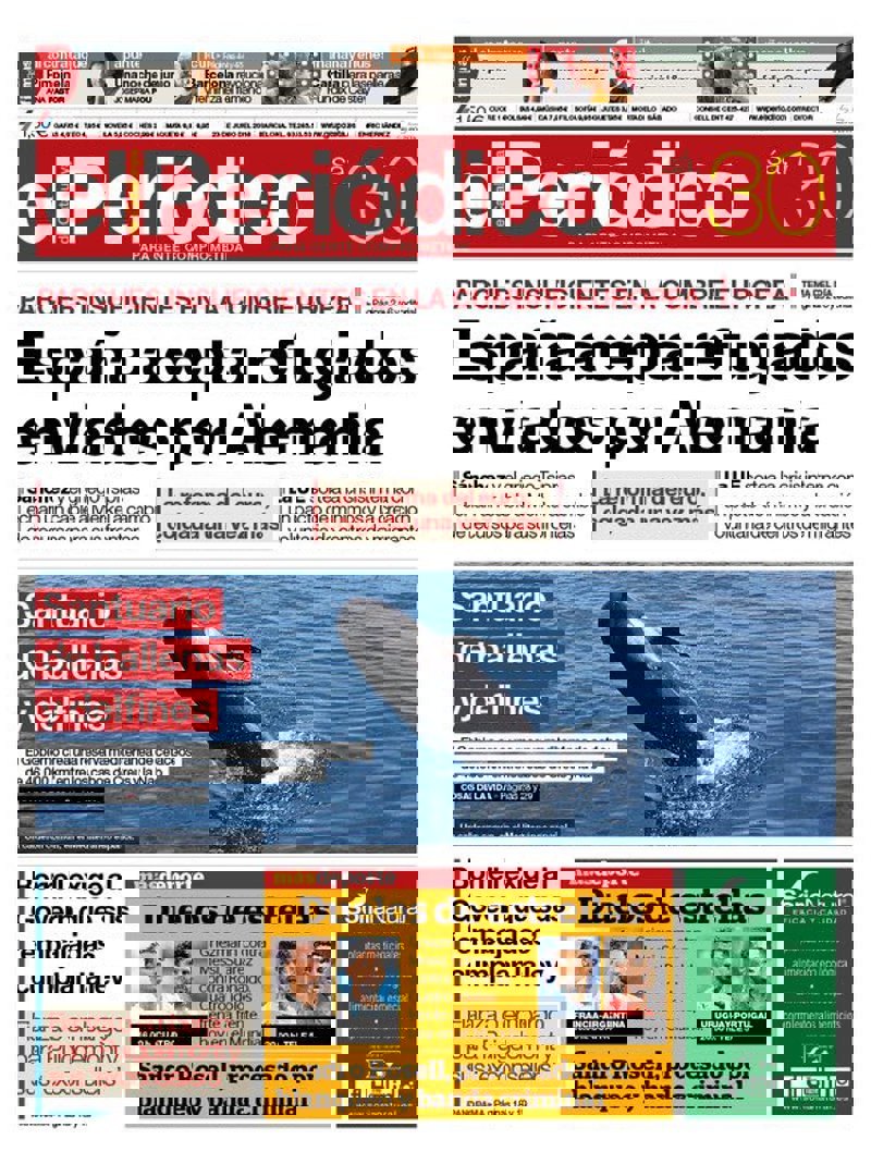 EL PERIÓDICO: "España acepta refugiados enviados por Alemania. La reforma del euro, congelada una vez más"; "Santuario de ballenas y delfines. El Gobierno crea una reserva mediterránea de cetáceos de 46.000 km2 entre los cabos de Creus y Nao"; "Borrell exige al Govern que sus 'embajadas' cumplan la ley"; "Fianza o embargo para Puigemont y sus 'exconsellers'".