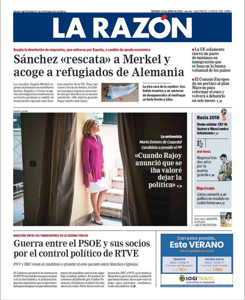 LA RAZÓN: "Sánchez "rescata" a Merkel y acoge a refugiados de Alemania. La otra cara de la cumbre: tres bebés muertos y un centenar de desaparecidos al naufragar un bote frente a Libia"; "María Dolores de Cospedal, candidata a presidir el PP: "Cuando Rajoy anunció que se iba valoré dejar la política""; "Guerra entre el PSOE y sus socios por el control político de RTVE".