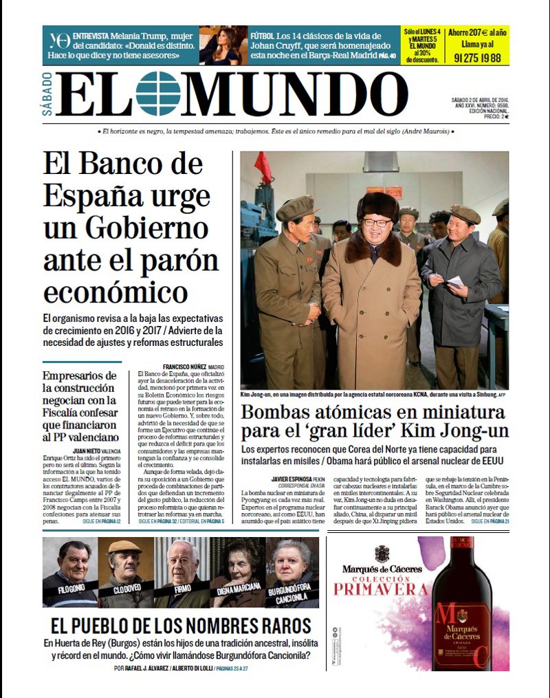 EL MUNDO: "El Banco de España urge un Gobierno ante el parón económico"; "Bombas atómicas en miniatura para el 'gran líder' Kim Jong-un. Los expertos reconocen que Corea del Norte ya tiene capacidad para instalarlas en misiles"; "Empresarios de la construcción negocian con la Fiscalía confesar que financiaron al PP valenciano"; "El pueblo de los nombres raros. En Huerta de Rey (Burgos) están los hijos de una tradición ancestral, insólita y récord del mundo".
