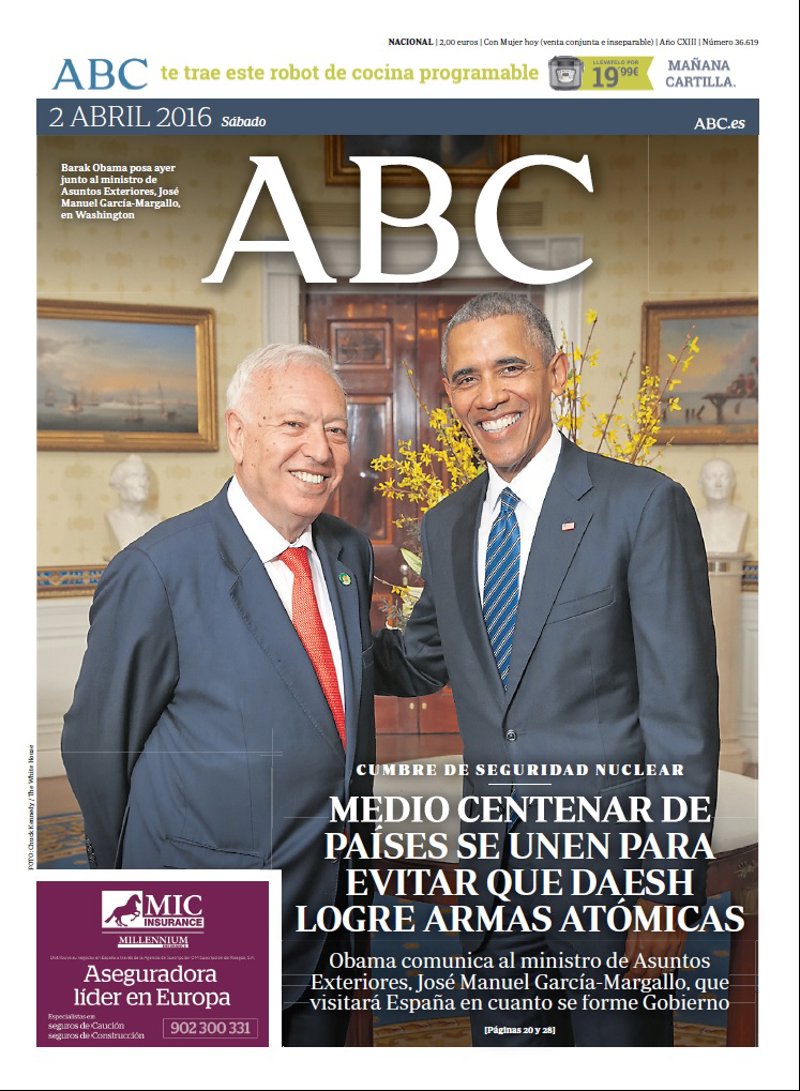 ABC: "Cumbre de Seguridad Nuclear. Medio centenar de países se unen para evitar que Daesh logre armas atómicas. Obama comunica al ministro de Asuntos Exteriores, José Manuel García-Margallo, que visitará España en cuanto se forme Gobierno".