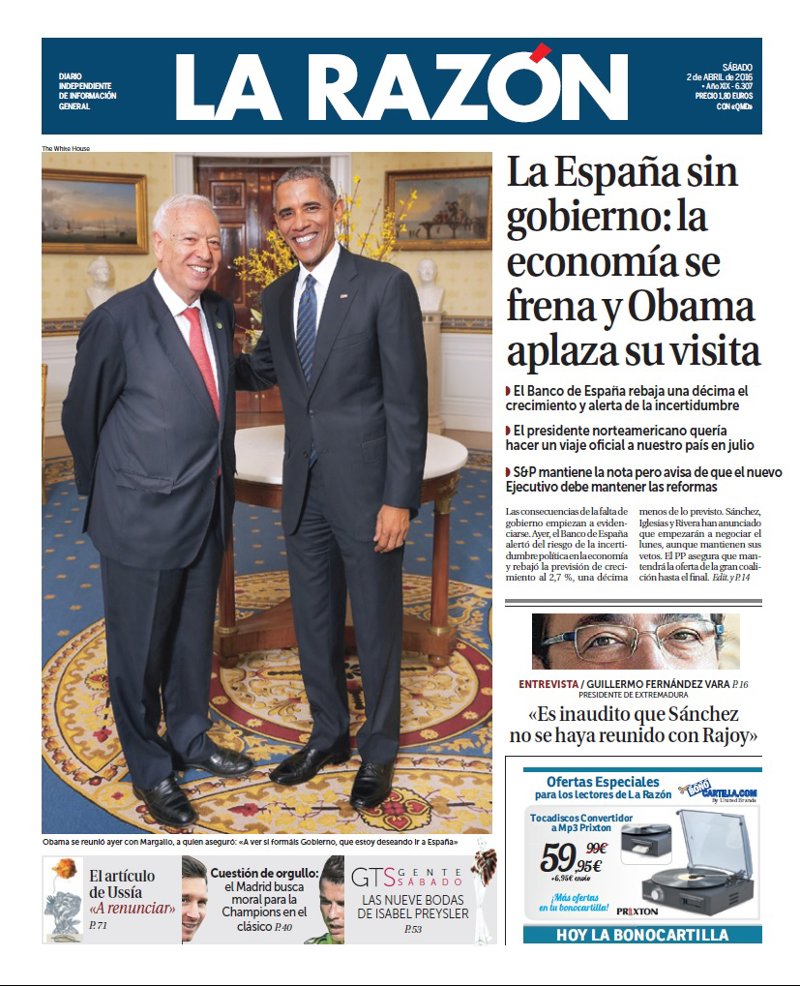 LA RAZÓN: "La España sin gobierno: la economía se frena y Obama aplaza su visita"; "Guillermo Fernández Vara, presidente de Extremadura: "Es inaudito que Sánchez no se haya reunido con Rajoy"".