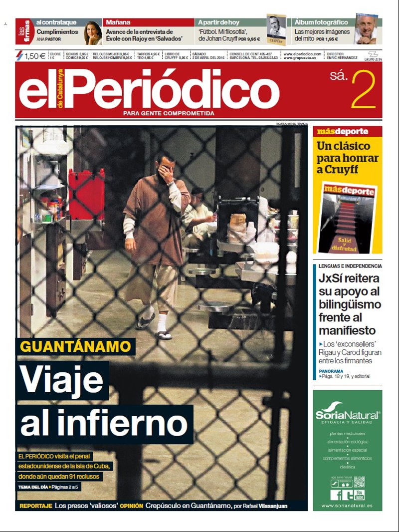 EL PERIÓDICO: "Guantánamo. Viaje al infierno. El Periódico visita el penal estadounidense de la isla de Cuba, donde aún quedan 91 reclusos"; "JxSí reitera su apoyo al bilingüismo frente al manifiesto"; "Un clásico para honrar a Cruyff".
