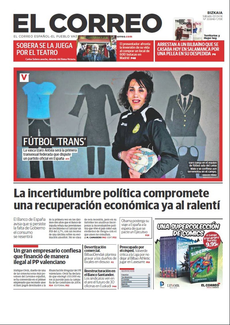 EL CORREO: "Fútbol 'trans'. La vasca Izaro Antxia será la primera transexual federada que dispute un partido oficial en España"; "La incertidumbre política compromete una recuperación económica ya al ralentí"; "Un gran empresario confiesa que financió de manera ilegal al PP valenciano".