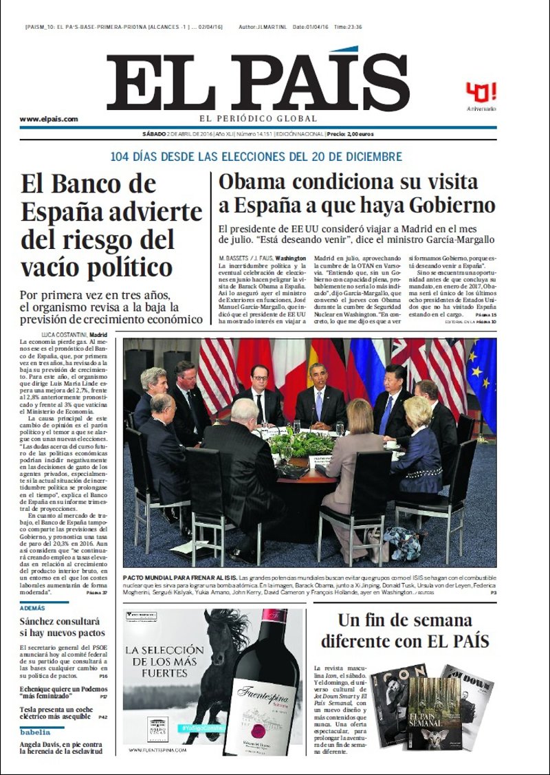 EL PAÍS: "El Banco de España advierte del riesgo del vacío político. Por primera vez en tres años, el organismo revisa a la baja la previsión de crecimiento económico"; "Obama condiciona su visita a España a que haya Gobierno"; "Pacto mundial para frenar al ISIS"; "Sánchez consultará si hay nuevos pactos".