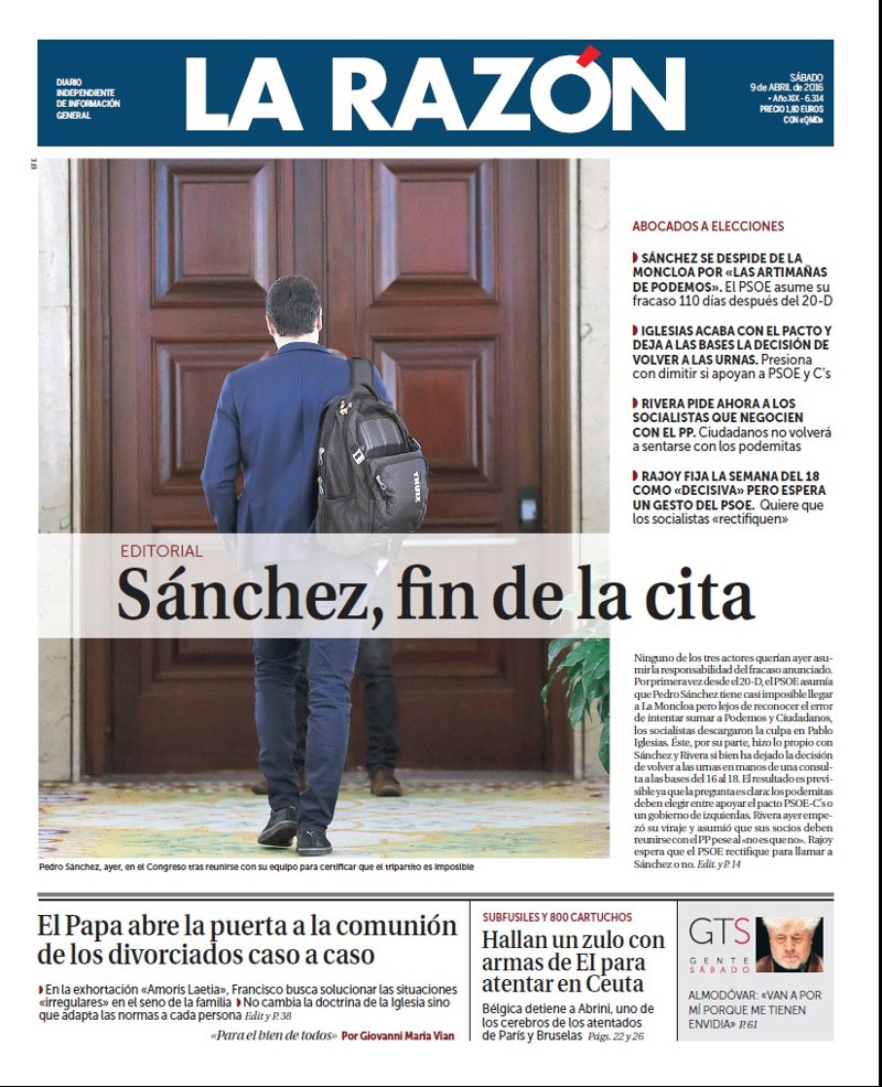 LA RAZÓN: "Sánchez, fin de la cita. Abocados a elecciones. Sánchez se despide de La Moncloa por "las artimañas de Podemos. Iglesias acaba con el pacto y deja a las bases la decisión de volver a las urnas. Rivera pide ahora a los socialistas que negocien con el PP. Rajoy fija la semana del 18 como "decisiva" pero espera un gesto del PSOE"; "El Papa abre la puerta a la comunión de los divorciados caso a caso"; "Hallan un zulo con armas de EI para atentar en Ceuta".