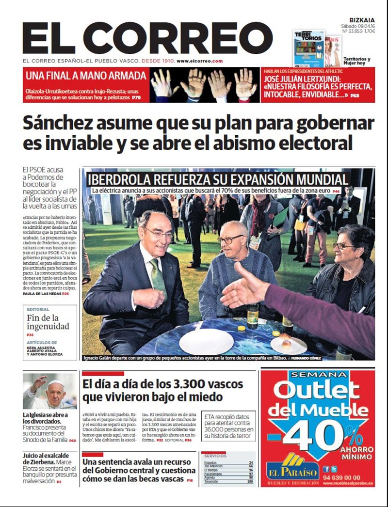 EL CORREO: "Sánchez asume que su plan para gobernar es inviable y se abre el abismo electoral"; "Iberdola refuerza su expansión mundial. La eléctrica anuncia a sus accionistas que buscará el 70% de sus beneficios fuera de la zona euro"; "El día a día de los 3.300 vascos que vivieron bajo el miedo"; "Una sentencia avala un recurso del Gobierno central y cuestiona cómo se dan las becas vascas".