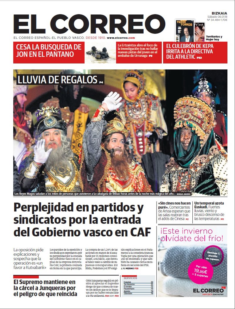 EL CORREO: "Lluvia de regalos"; "Perplejidad en partidos y sindicatos por la entrada del Gobierno vasco en CAF"; "El Supremo mantiene en la cárcel a Junqueras por el peligro de que reincida".