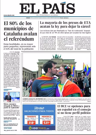 EL PAÍS: "El 80% de los municipios de Cataluña avalan el referéndum"; "La mayoría de los presos de ETA acatan la ley para dejar la cárcel"; "Alemania legaliza el matrimonio gay"; "El BCE ve opciones para un español en el consejo si no tiene perfil político".