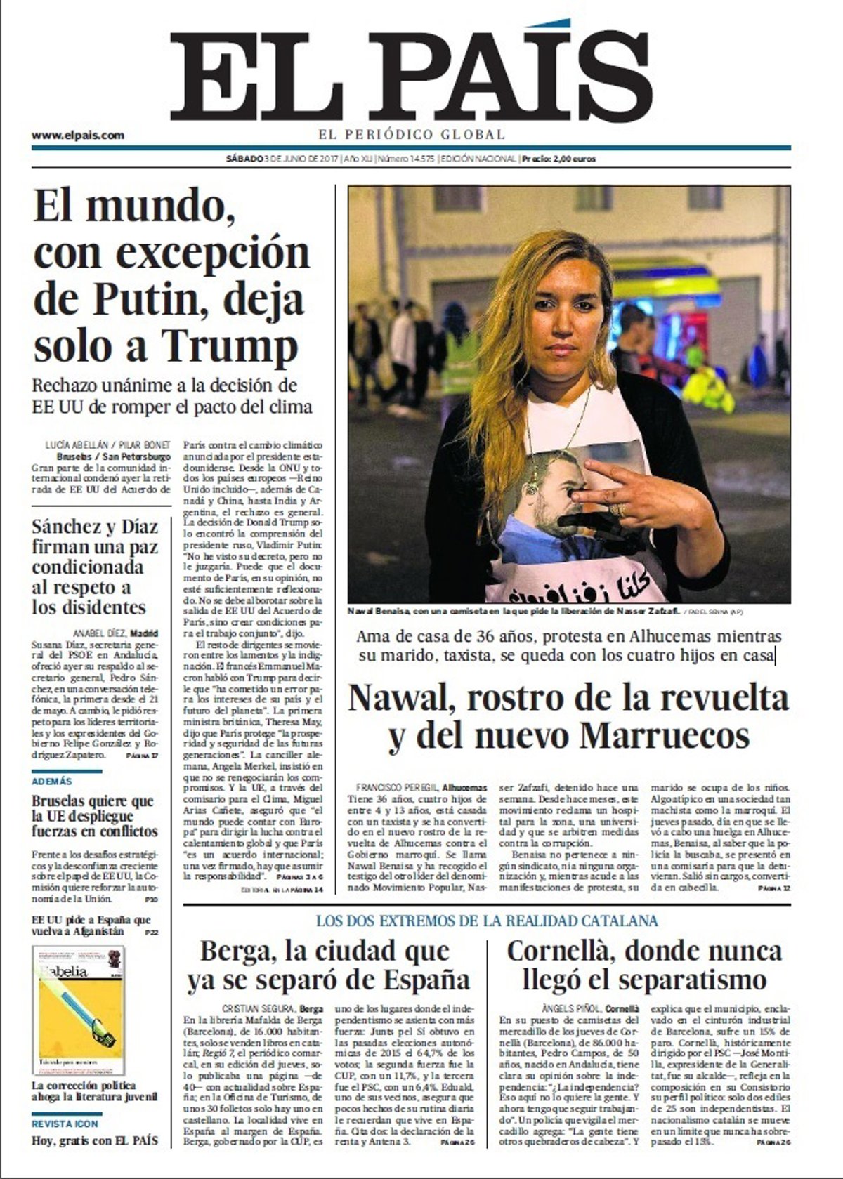 EL PAÍS: "El mundo, con excepción de Putin, deja solo a Trump"; "Nawal, rostro de la revuelta y del nuevo Marruecos. Ama de casa de 36 años, protesta en Alhucemas mientras su marido, taxista, se queda con los cuatro hijos en casa"; "Los dos extremos de la realidad catalana. Berga, la ciudad que ya se separó de España. Cornellà donde nunca llegó el separatismo"; "Sánchez y Díaz firman una paz condicionada al respeto a los disidentes".
