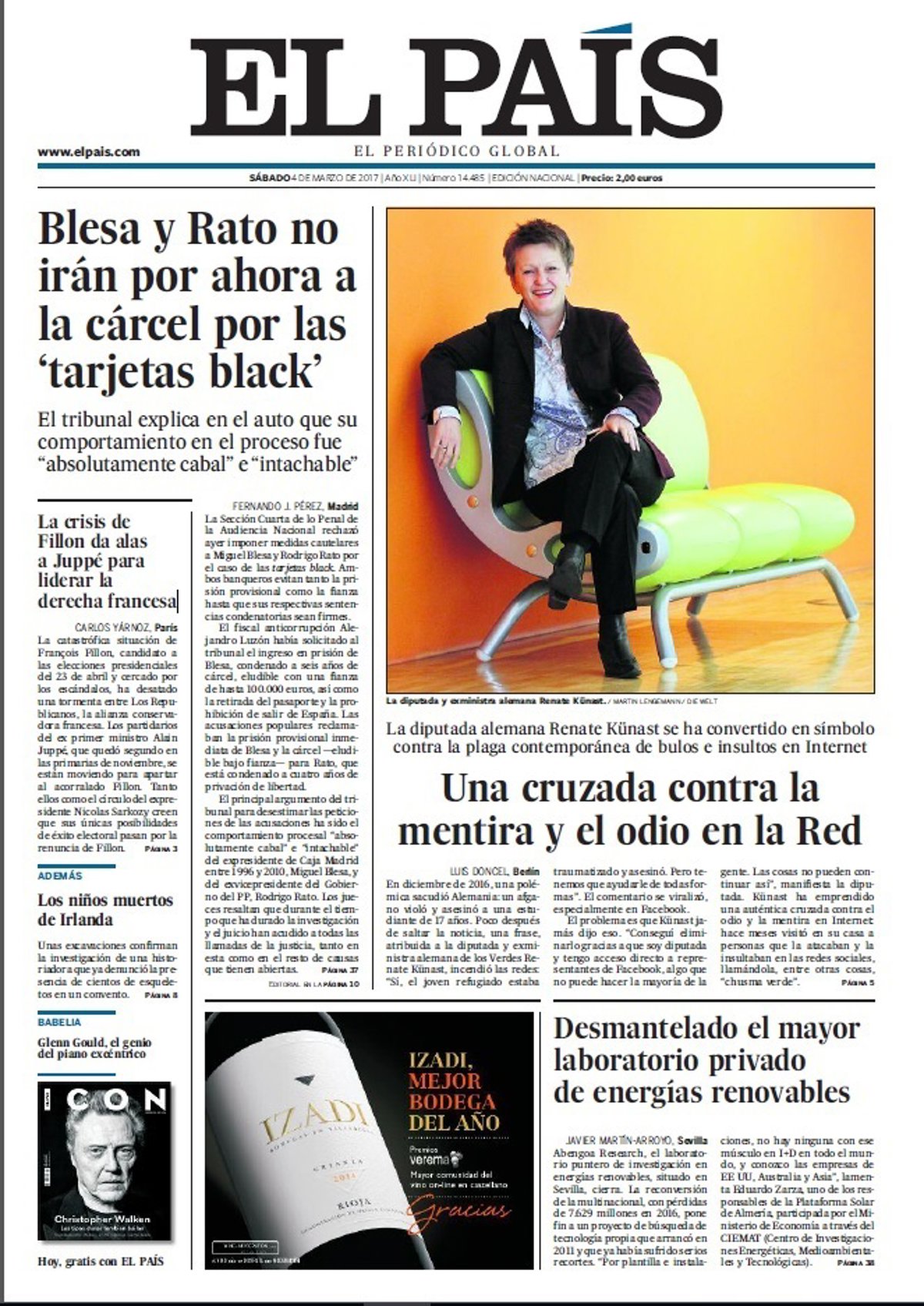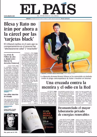 EL PAÍS: "Blesa y Rato no irán por ahora a la cárcel por las 'tarjetas black'"; "Una cruzada contra la mentira y el odio en la Red. La diputada alemana Renate Künast se ha convertido en símbolo contra la plaga contemporánea de bulos e insultos en Internet"; "Desmantelado el mayor laboratorio privado de energías renovables"; "La crisis de Fillon da alas a Juppé para liderar la derecha francesa".