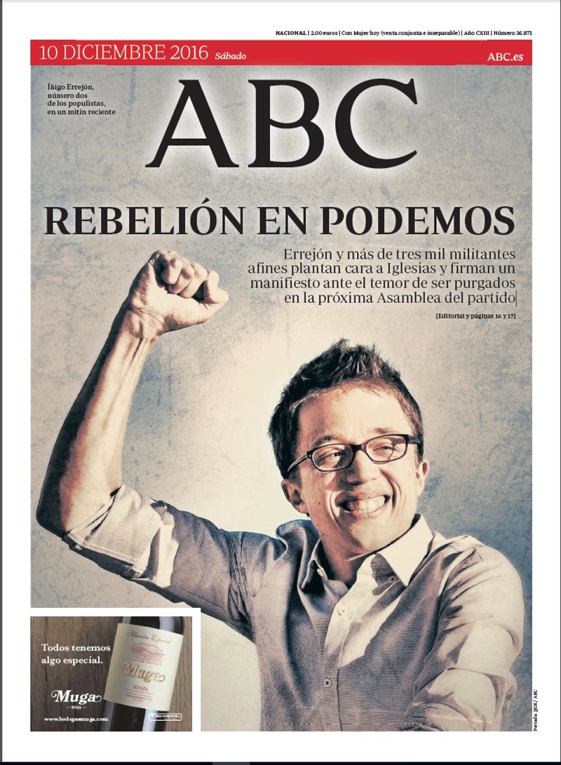 ABC: "Rebelión en Podemos. Errejón y más de tres mil militantes afines plantan cara a Iglesias y firman un manifiesto ante el temor de ser purgados en la próxima Asamblea del partido".