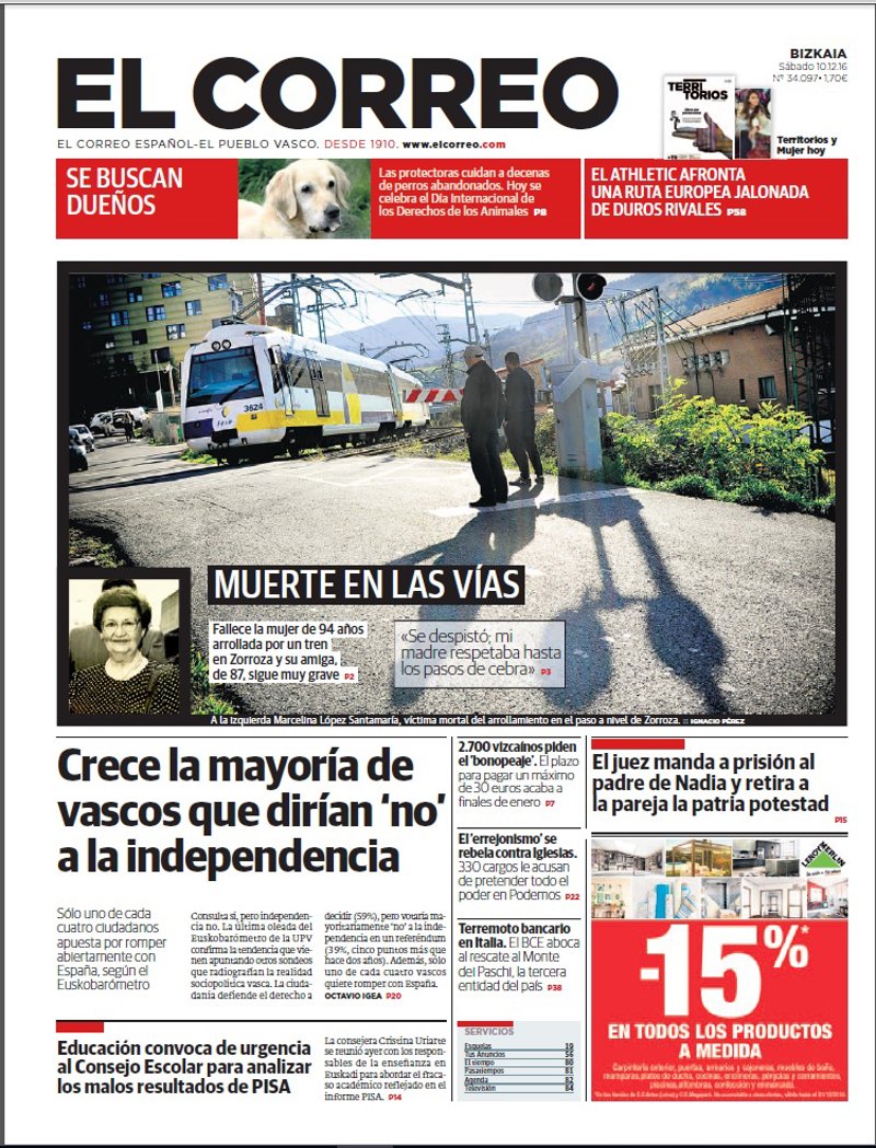 EL CORREO: "Muerte en las vías. Fallece la mujer de 94 años arrollada por un tren en Zorroza y su amiga, de 87, sigue muy grave"; "Crece la mayoría de vascos que dirían 'no' a la independencia"; "Educación convoca de urgencia al Consejo Escolar para analizar los malos resultados de PISA"; "El juez manda a prisión al padre de Nadia y retira a la pareja la patria potestad".
