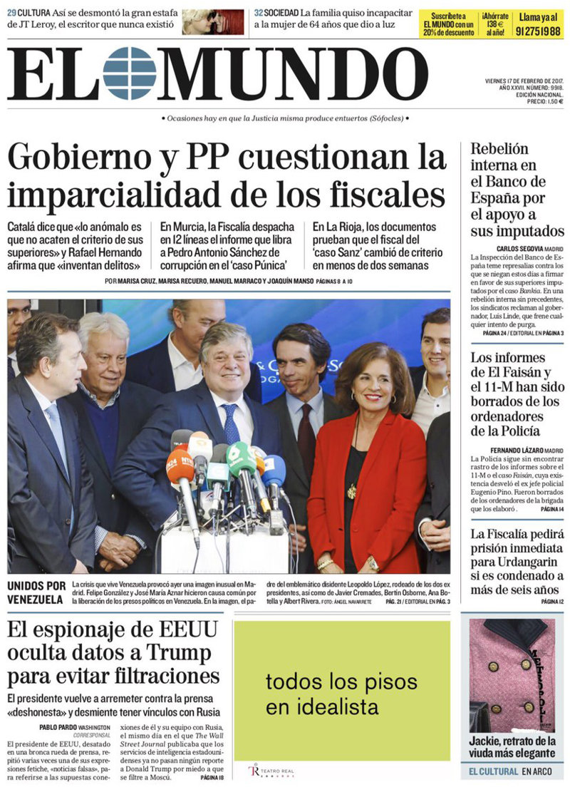 EL MUNDO: "Gobierno y PP cuestionan la imparcialidad de los fiscales"; "El espionaje de EEUU oculta datos a Trump para evitar filtraciones"; "Rebelión interna en el Banco de España por el apoyo a sus imputados"; "Los informes de El Faisán y el 11-M han sido borrados de los ordenadores de la Policía".