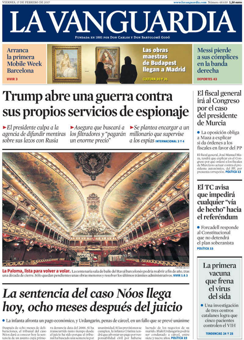 LA VANGUARDIA: "Trump abre una guerra contra sus propios servicios de espionaje"; "La sentencia del caso Nóos llega hoy, ocho meses después del juicio"; "El fiscal general irá al Congreso por el caso del presidente de Murcia"; "El TC avisa que impedirá cualquier "vía de hecho" hacia el referéndum"; "La primera vacuna que frena el virus del sida".