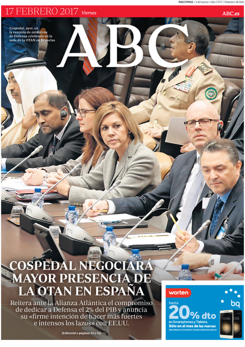 ABC: "Cospedal negociará mayor presencia de la OTAN en España. Reitera ante la Alianza Atlántica el compromiso de dedicar a Defensa el 2% del PIB y anuncia su "firme intención de hacer más fuertes e intensos los lazos" con EEUU".