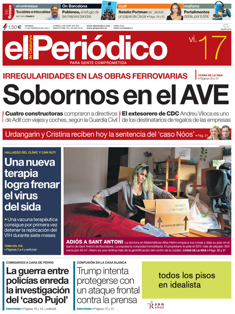 EL PERIÓDICO: "Sobornos en el AVE. Cuatro constructoras compraron a directivos de Adif con viajes y coches, según la Guardia Civil"; "Urdangarín y Cristina reciben hoy la sentencia del 'caso Nóos"; "Una nueva terapia logra frenar el virus del sida"; "La guerra entre policías enreda la investigación del 'caso Pujol".