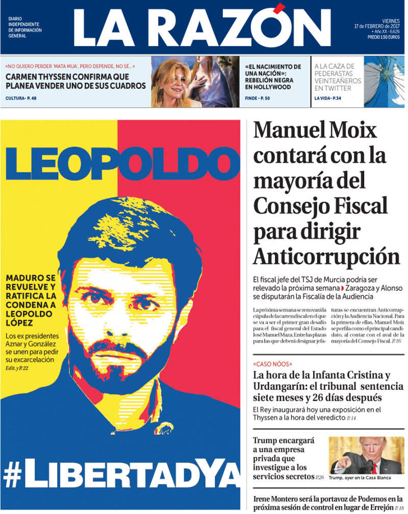 LA RAZÓN: "Manuel Moix contará con la mayoría del Consejo Fiscal para dirigir Anticorrupción"; "La hora de la Infanta Cristina y Urdangarín: el tribunal sentencia siete meses y 26 días después"; " Trump encargará a una empresa privada que investigue a los servicios secretos"; "Irene Montero será la portavoz de Podemos en la próxima sesión de control en lugar de Errejón".