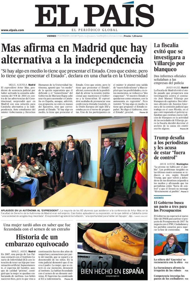 EL PAÍS: "Mas afirma en Madrid que hay alternativa a la independencia"; "La fiscalía evitó que se investigara a Villarejo por blanqueo"; "Trump desafía a los periodistas y les acusa de estar "fuera de control"; "Historia de un embarazo equivocado. Una mujer tardó años en saber que fue fecundada con el semen de un extraño".