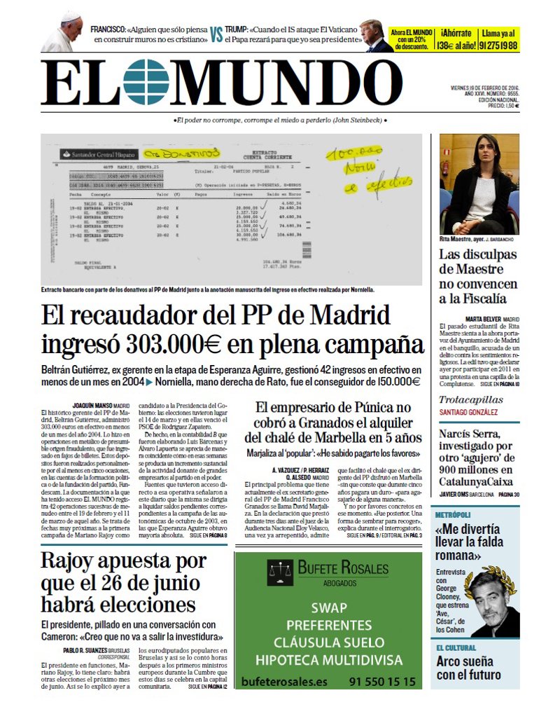 EL MUNDO: "El recaudador del PP de Madrid ingresó 303.000 euros en plena campaña"; "El empresario de Púnica no cobró a Granados el alquiler del chalé de Marbella en cinco años"; "Rajoy apuesta a por que habrá elecciones el 26 de junio"; "Narcís Serra, investigado por otro 'agujero' de 900 millones en CatalunyaCaixa".