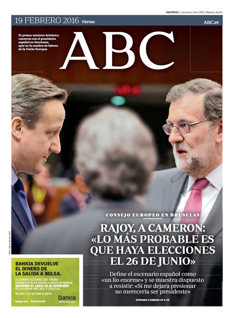 ABC: Rajoy a Cameron: "Lo más probable es que haya elecciones el 26 de junio". Define el escenario español como un "lío enorme" y se muestra dispuesto a resistir: "Si me dejara presionar no merecería ser presidente".